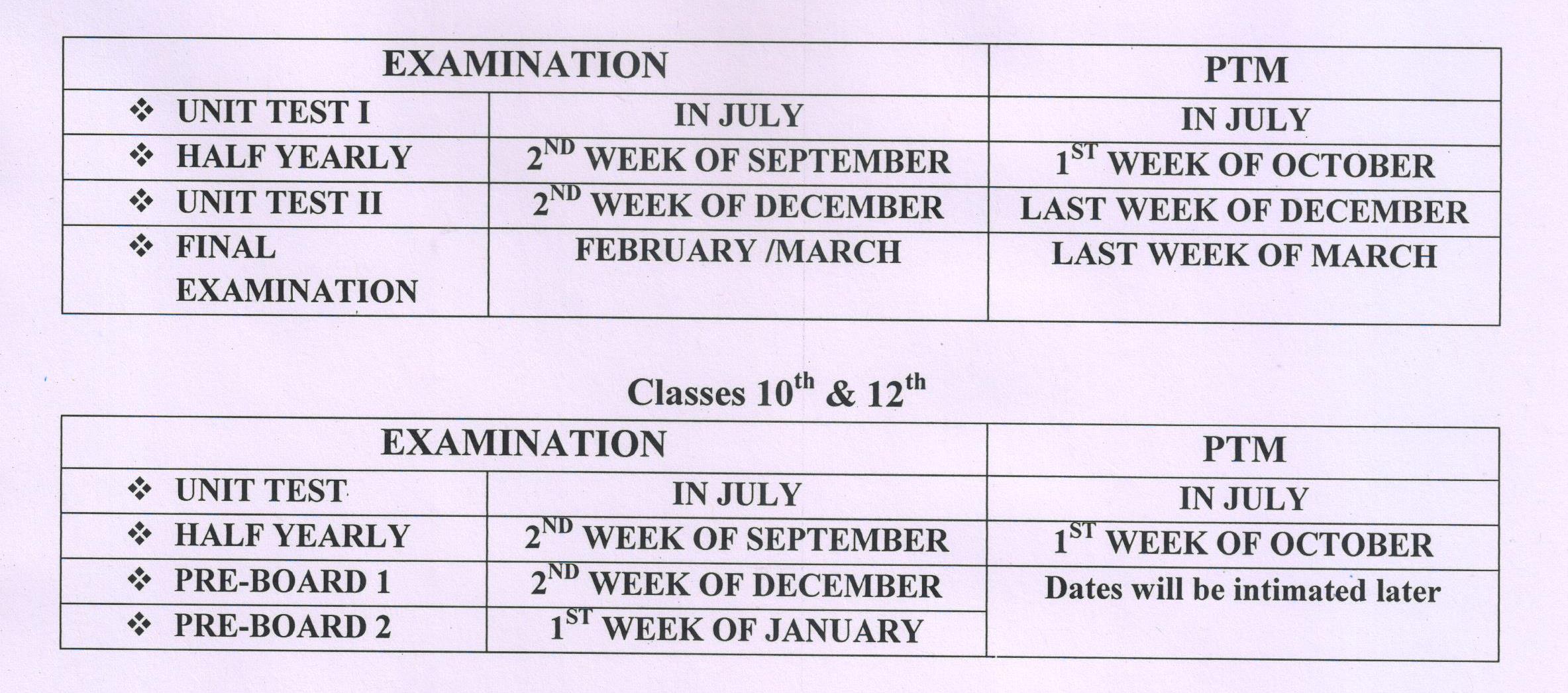Schedule of exams
